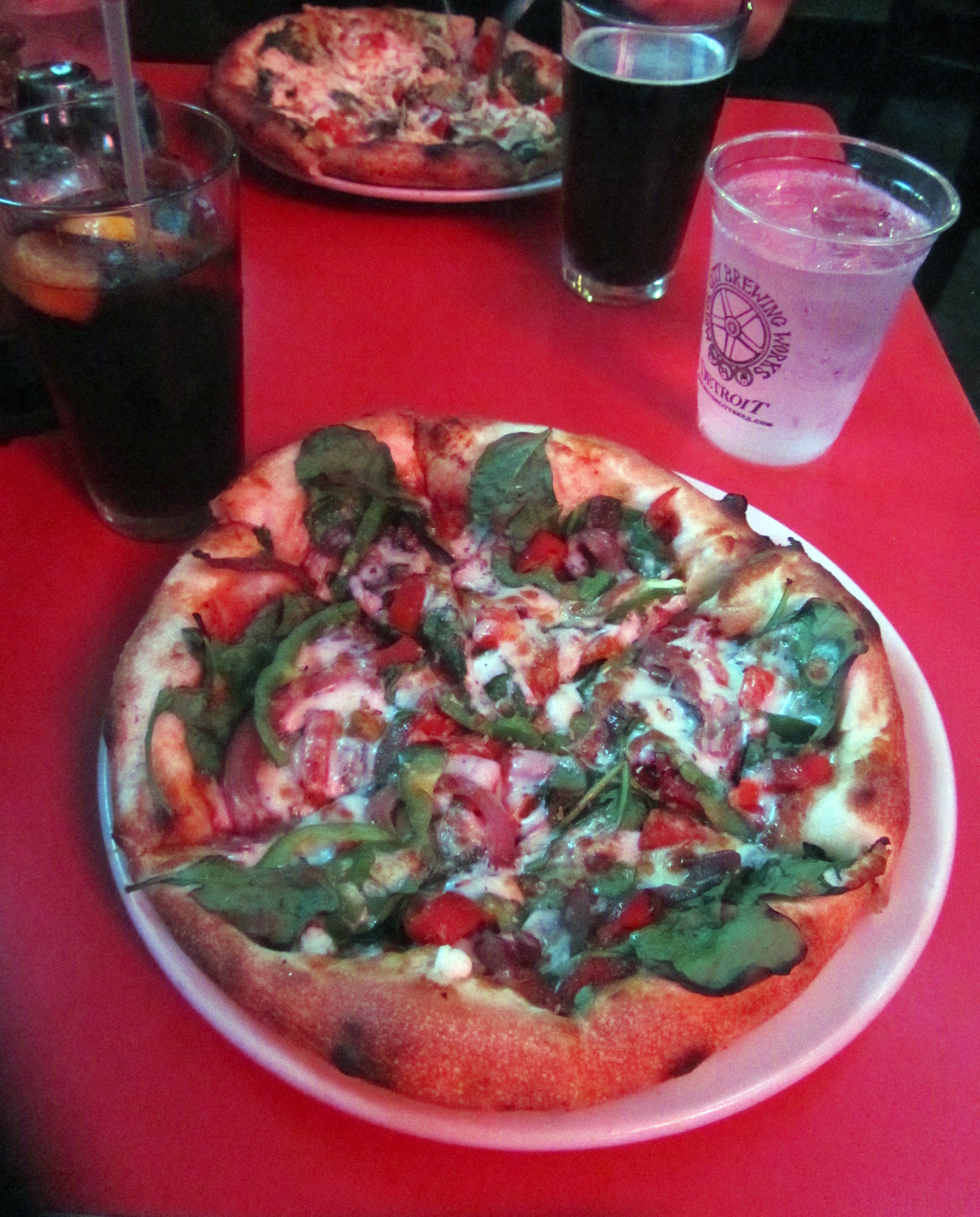 I’m not a beer drinker, so I can’t comment on the beer. But I had a great pizza. The pizzas are about the size of your average dinner plate, and they’re perfect for one person. Since they’re not in the least bit greasy, they don’t make you feel overstuffed. I opted for the “build your own,” and had carmelized onions, roasted red peppers, and spinach on mine:
