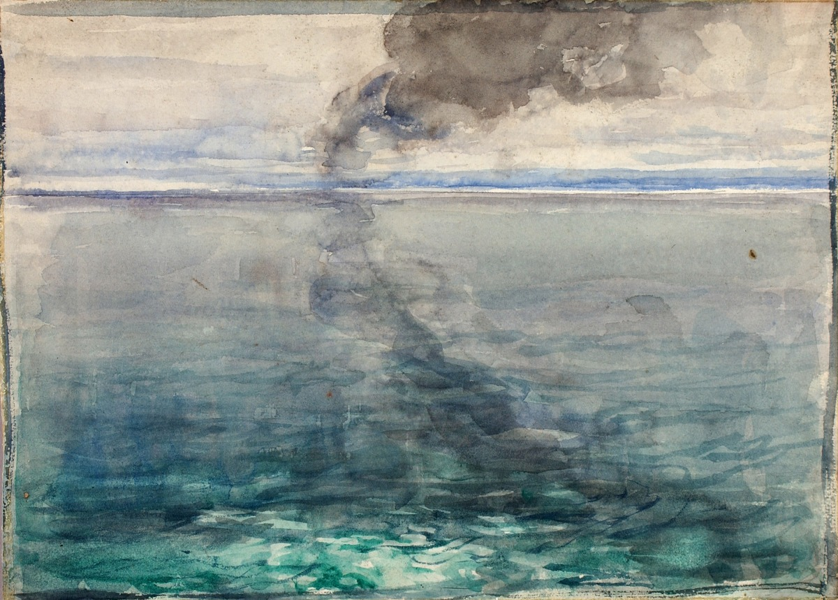 Tanner was born in Pittsburgh. His father was an AME bishop, and both his parents were educated; they ensured that all their children received an education (including a younger sister who practiced medicine.) Having decided at thirteen that he wanted to be a painter, Tanner studied at the Pennsylvania Academy of the Fine Arts in Philadelphia. Over the years, his work took a variety of styles as well as subjects, including landscapes, religious themes, and daily life. He is famous as the first internationally renowned African-American artist. He lived in Paris2 from 1891 until his death in 1937, returning to the US from time to time for professional activities, and of course, to visit family. His 1894 watercolor, Crossing the Atlantic (Return Home) (below) may have been a way to pass time on a long ocean trip, or a study in the colors, shadows, and textures of clouds and sea water; but it gives us a sense of the vastness of the ocean and isolation of the ship that no doubt would have been dwarfed by its setting.