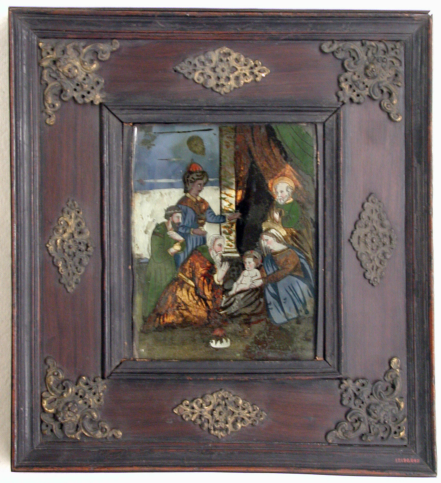 That small size seems appropriate: Like the magus shown on his knees adoring the Christ child, we must lean in, make ourselves smaller, get close to the image to make out the details. The technique, verre églomiseé, or “gilded glass,” involves applying gold leaf to the back of a piece of glass, then painting the image in reverse: the details first, then the background colors. I’m not a painter, so I can only imagine how tricky that mst be. Disorienting, even.