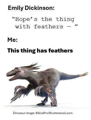 Yeah, yeah, I misquoted Dickinson. (She wrote, “Hope is the thing with feathers,” not “Hope’s the thing…”