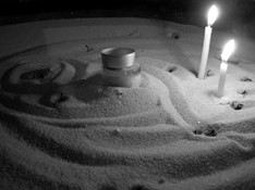 Tapers flicker, melt down into sand: